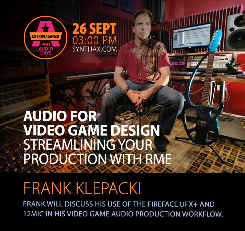 Frank will discuss his use of the Fireface UFX+ and 12MIC in his video game audio production workflow. It will showcase how using the UFX+ and 12MIC allowed him to eliminate an entire rack of gear and streamline his process using RME’s TotalMix FX. Throughout the session Frank will discuss his approach to audio design for video game production…discussions will include his creative approach, his gear, his need to have any aspect of his studio ready to go at a moments notice, and how RME has improved his setup.